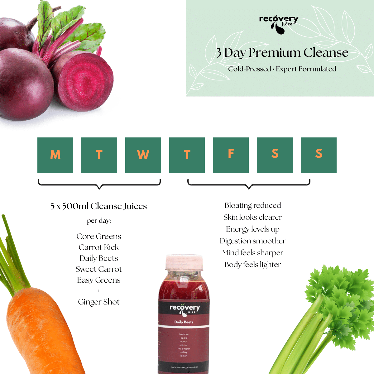 Each day includes five 500 ml cold-pressed juices, providing sustained hydration alongside vitamins, minerals and antioxidants.